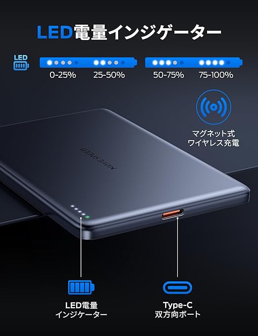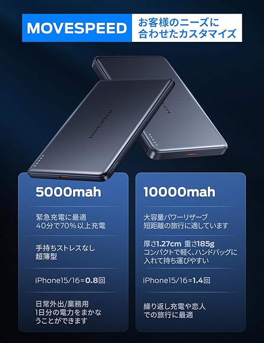 【Magsafe対応・超薄型】MOVE SPEED モバイルバッテリー 小型 軽量 ワイヤレス マグネット iPhone 16/15/14などとAndroid対応 マグセーフ 新入学セット 充電器 バッテリー LED残量 2台同時充電 PSE認証済み 学生に人気/授業/通勤/旅行/出張/緊急用 a
