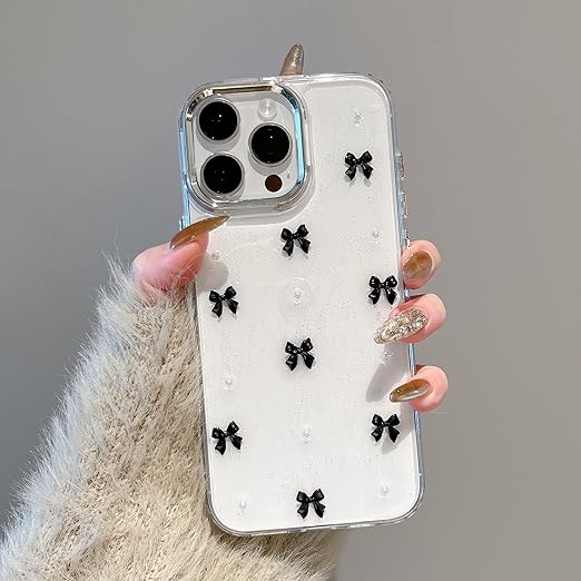 QLTYPRI iPhone13 Pro ケース クリア ブラック ミニリボン おしゃれ 韓国 iPhone13 Proカバー 透明 可愛い 耐衝撃 スマホケース 立体 りぼん装飾 きらきら アイフォン13 Pro ケース、ブラック a