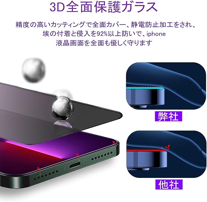 ①【対応機種】iPhone 13promax(アイフォン13 プロマックス) 6.7インチ用。同梱物:28°覗き見防止強化ガラスフィルム2枚、レンズ保護フィルム 2枚 、ガイド枠1個 、滑り止めマット*1、取扱説明書。商品は一枚一枚手作業で検査しましたので、品質は非常に安定しております、ご安心して弊社の製品をお買い求めください。