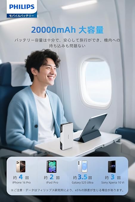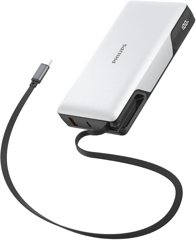 Philips (フィリップス) 巻き取り式 モバイルバッテリー 20000mAh 大容量 入出力 タイプc 約70CMケーブル内蔵 22.5W急速充電 3台同時充電 USB-Cポート パススルー機能搭載 iOS/Android対応 機内持込可 旅行/出張/停電対策/防災グッズ DLP2721CW a