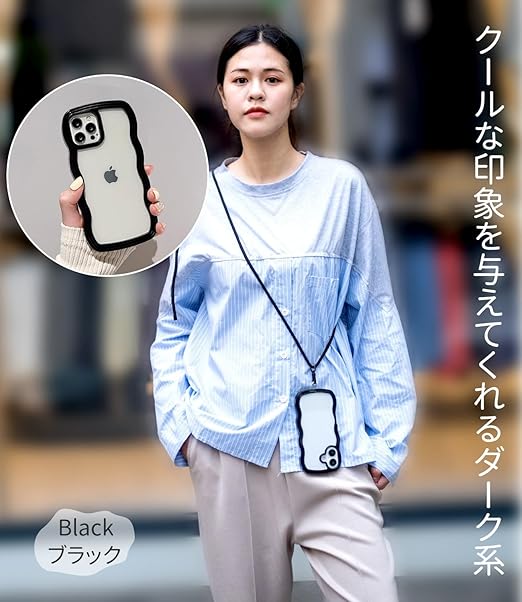 【うねうねケース・クリア・フチが可愛い】トレンドのなみなみケースに可愛い ショルダー ストラップを追加した!ウェーブ形とパステルカラーのフレーム、そしてクリアな背面で、シールなどを入れるととても可愛いです。フレームのみ取り外しもできるので完全クリアケースとしても使えます。肌なじみのいい配色で、どの年代の方にもおすすめの透明ケースです。ショルダーストラップを付ければ持ち方も変えられます!