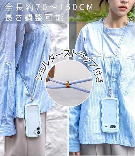 【うねうねケース・クリア・フチが可愛い】トレンドのなみなみケースに可愛い ショルダー ストラップを追加した!ウェーブ形とパステルカラーのフレーム、そしてクリアな背面で、シールなどを入れるととても可愛いです。フレームのみ取り外しもできるので完全クリアケースとしても使えます。肌なじみのいい配色で、どの年代の方にもおすすめの透明ケースです。ショルダーストラップを付ければ持ち方も変えられます!