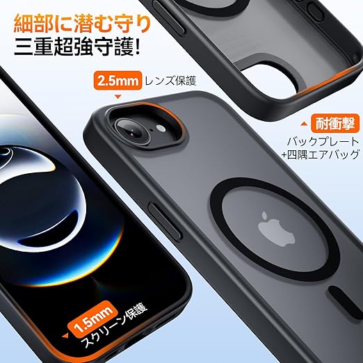 Eiffebill for iPhone 16E ケース 【耐衝撃、米軍規格】【Mag Safe(マグセーフ)対応、マグネット搭載、ワイアレス充電対応】【半透明で、サンドブラスト処理により肌触りが柔らかく、黄変に強いです】ストラップホール付き(くろ) a