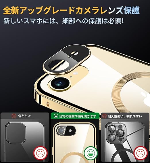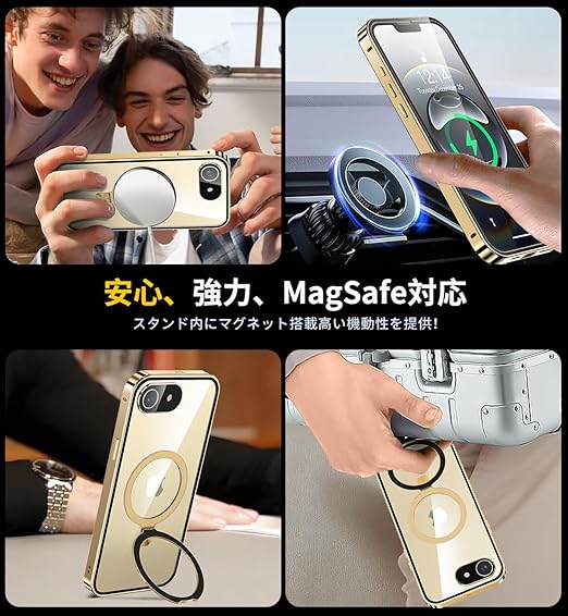 HGUTREY【スタンド機能付き・アクションボタン】 iPhone16e 用 ケース クリア 【ロック付き】【CDリング・MagSafe対応】 9H強化ガラス PC背面 一体型レンズ保護 アイフォン16e カバー 両面 ストラップホール付き アルミバンパー メタルフレーム 耐衝撃 高感度タッチ ワイヤレス充電対応 アイホン16e 用 ケース 6.1インチ(ゴールド) a