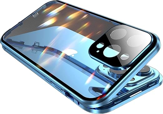 iPhone 15 ケース 全面カバー ロック機能付き+マグネット式 両面クリア強化ガラス 安全ロック カメラ保護 アルミバンパー アイフォン15 ガラスケース 両面ケース 透明 (iPhone15, 薄ブルー) a