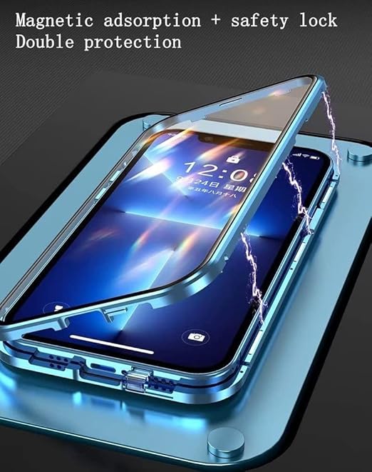 iPhone 14 ケース 全面カバー ロック機能付き+マグネット式 両面クリア強化ガラス 安全ロック カメラ保護 アルミバンパー アイフォン14 ガラスケース 両面ケース 透明 (iPhone14, 薄紫) a