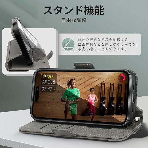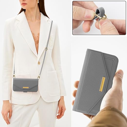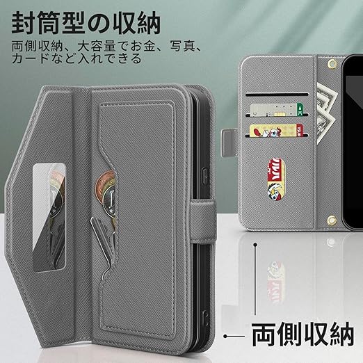 NODALA iPhone 15 ケース 手帳型 アイフォン15 スマホケース 財布型 ショルダー あいふぉん15 携帯ケース 肩掛け 斜めがけ カバー 手帳型 小銭入れ カード収納 ロングストラップ 長さ調節可能 ミラー付き女性 おしゃれ 横置 ステント機能 折りたたみ 耐衝撃 PUレザー ダークグレー a