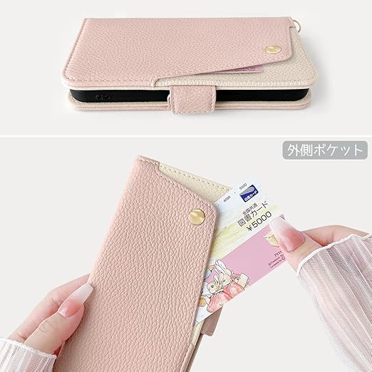 【カード収納 メ 横置きスタンド機能】外 側 ケ ー ス の 外 側 の ボ タ ン を 外 す と ポ ケ ッ ト が、内側に実用性のカード入れポケッ