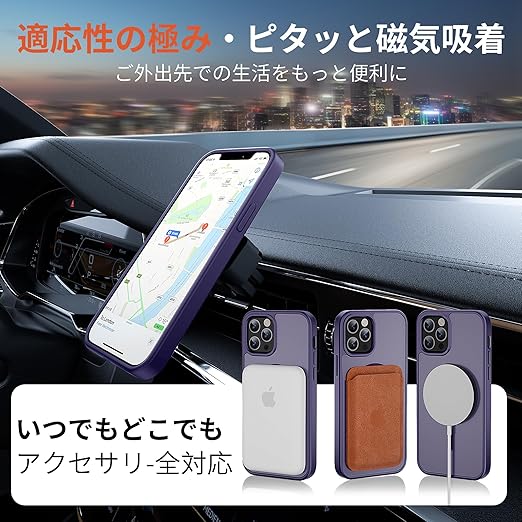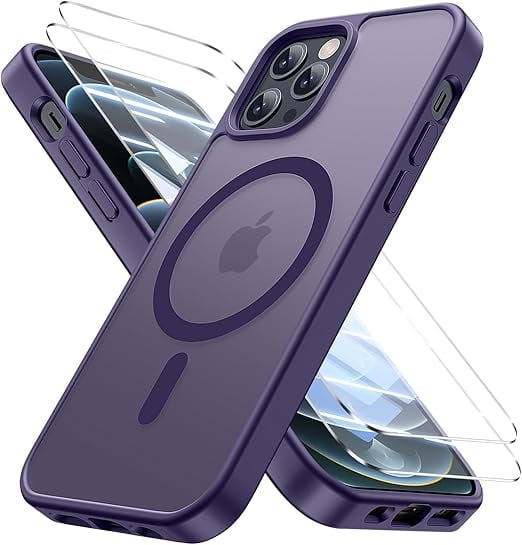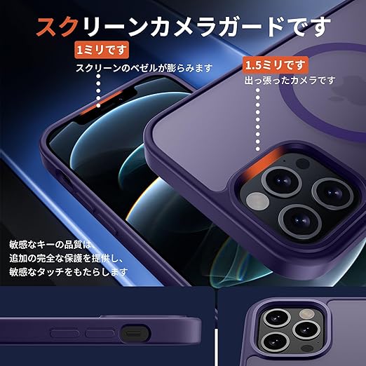 Bruzaio iPhone 12/ iPhone 12 Pro 用 ケース【強化フィルム2枚付き】Magsafe対応・米軍規格 いphone12 ケース 半透明 耐衝撃 指紋防止 滑り止め マグネット搭載 ワイヤレス充電 耐久性 全面保護 黄ばみなし ストラップホール付き 12/12 Proスマホケース 6.1インチ用,ダークパープル a