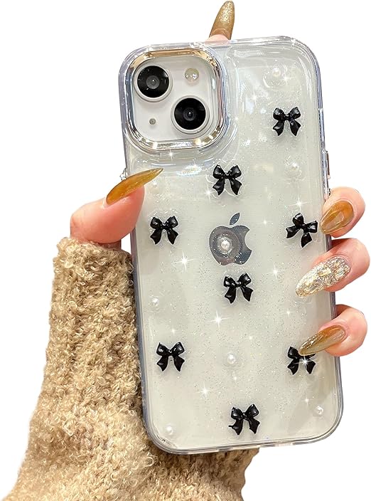 QLTYPRI iPhone15 ケース クリア ブラック ミニリボン おしゃれ 韓国 iPhone15ケース 透明 可愛い 耐衝撃 スマホケース 立体 りぼん装飾 きらきら アイフォン15 ケース、ブラック a