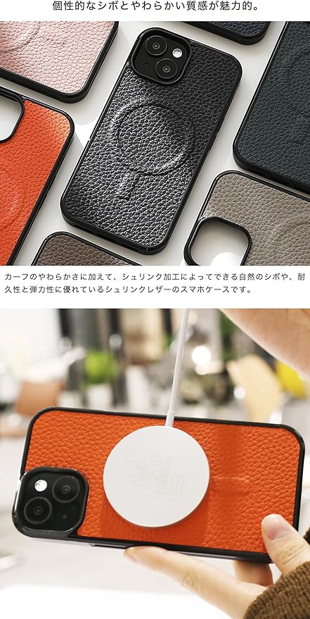 【素材】ケース背面 : シュリンクレザー(シュランケンカーフレザー)皮の銀面(製革工程で毛や表皮を除去した真皮の表面)を収縮(シュリンク加工)させ、本来の銀面模様を強調した革。 本体(内側) : PC(ポリカーボネート) 本体(側面) : TPU(熱可塑性ポリウレタン)