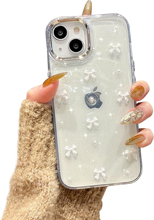 QLTYPRI iPhone15 ケース クリア ホワイト ミニリボン おしゃれ 韓国 iPhone15ケース 透明 可愛い 耐衝撃 スマホケース 立体 りぼん装飾 きらきら アイフォン15 ケース、ホワイト a