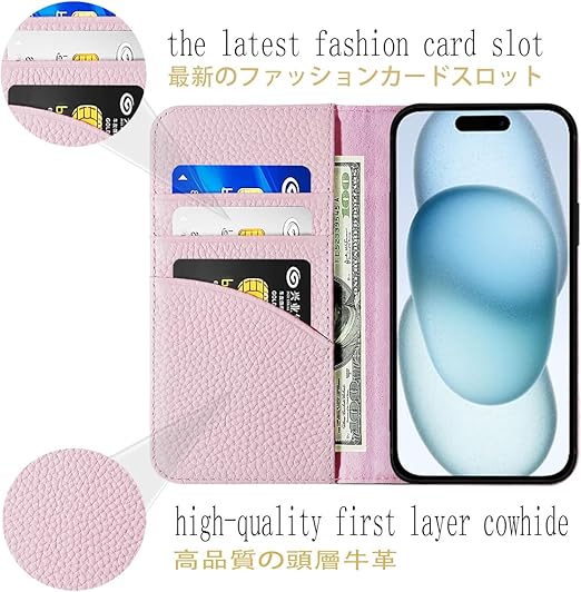 iPhone 15 ケース 本革 手帳型 カバー 耐衝撃 保護 カバー 本革 内蔵マグネッ RFIDト 財布型 携帯カバー カードポケット スタンド機能 NanHou - グレー/ピンク a