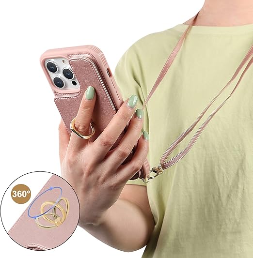 Cavor iPhone 15 Plus 手帳型ケースiPhone15 Plus スマホケースショルダー クロスボディ肩掛け 首かけ 斜めがけ ショルダー ケース 背面ポケット付きiPhone 15 Plus 財布型ケース【上下開】iPhone 15 Plus 携帯ケース【RFID機能】iPhone 15 Plus case カード収納 360°回転リング 可愛横置-ピンク a