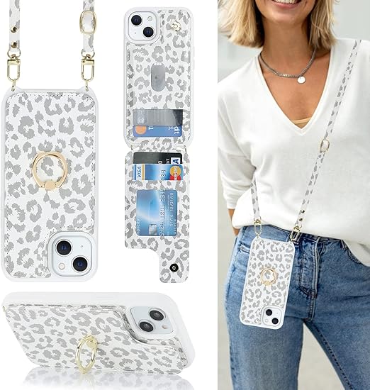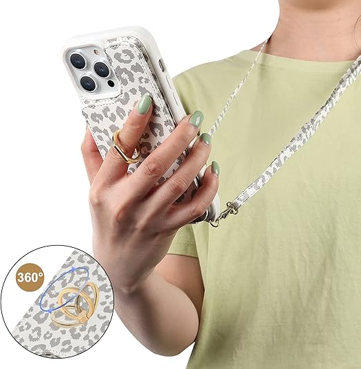 Cavor iPhone 15 Plus 手帳型ケースiPhone15 Plus スマホケースショルダー クロスボディ肩掛け 首かけ 斜めがけ ショルダー ケース 背面ポケット付きiPhone 15 Plus 財布型ケース【上下開】iPhone 15 Plus 携帯ケース【RFID機能】iPhone 15 Plus case カード収納 360°回転リング 可愛横置-白ヒョウ柄 a