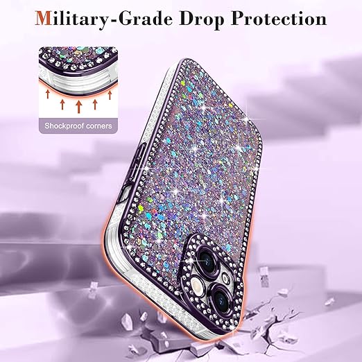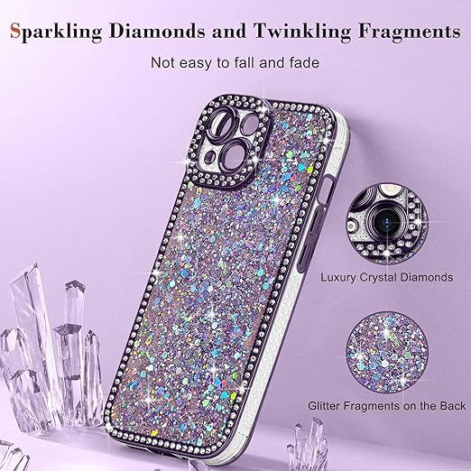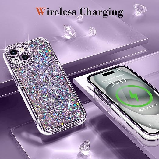 Lafunda iPhone 15 用 ケース キラキラ ラメ ダイヤモンドストーン デコ 女の子 豪華 人気 衝撃吸収 TPU 軽量 落下防止 おしゃれ ワイヤレス充電対応 アイホン15 用携帯ケース 6.1インチ対応 パープル a
