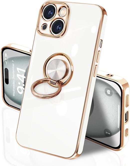 JOUMIN YAO iPhone 15 ケース リング付き イフォン15 リング TPU カバー 全面保護 耐衝撃 スマホケース iPhone 15 360°回転 スタンド機能 携帯カバー 車載ホルダー対応 ストラップホール付き メッキ加工 擦り傷防止 6.1インチ(ホワイト) a