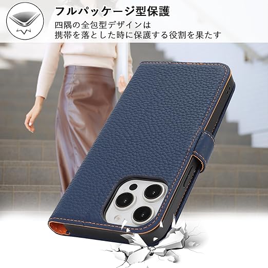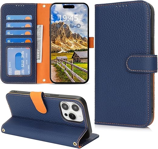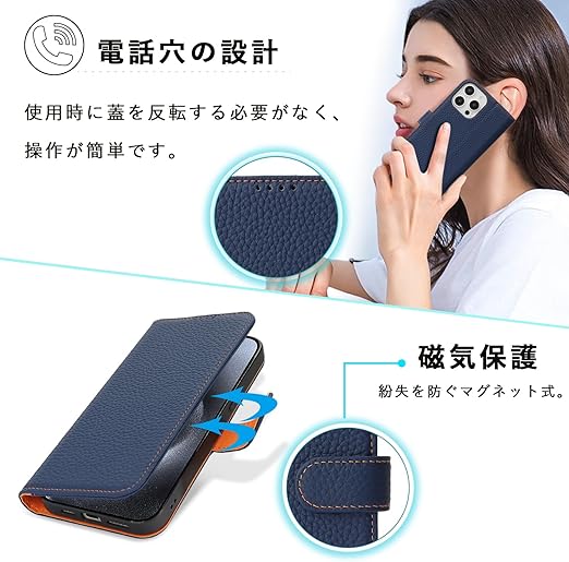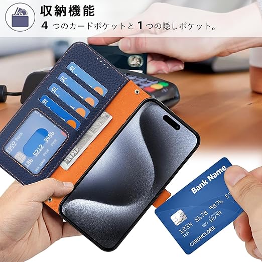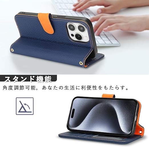 DEYHU 対応 いphone15pro ケース 手帳型 カード収納 スタンド機能 iphone15pro ケース 本革 大容量 財布型 耐衝撃 iphone 15 pro ケース 手帳型 iphone15プロ レザー カバー ブルー と オレンジ a