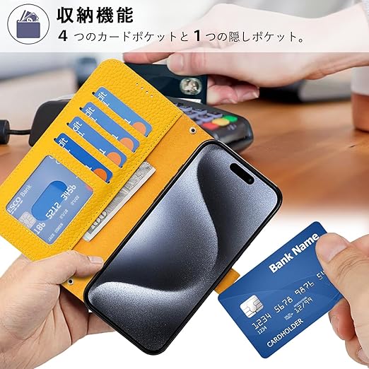 【収納機能】ケース内側には四つのカード入れとフリーポケットがつき、カード類や紙幣、名刺などが収納できます。普段の生活に便利をもたらします。