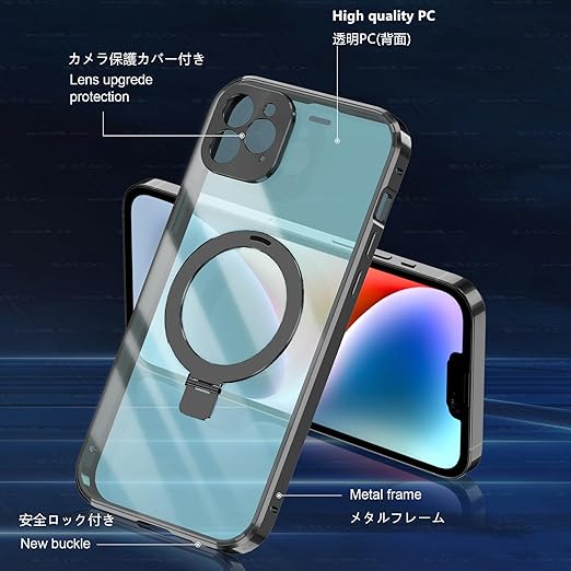 iPhone15Pro 用 ケース 覗き見防止 iPhone 15 Pro ケース MagSafe対応 ワイヤレス充電対応 全面カバー リング付き スタンド機能 一体型レンズ保護 iphone 15 Pro カバー ロック式 両面ケースマグネット式 強化ガラス アイフォン15pro クリア ケース (iPhone15Pro, ダークブルー) a