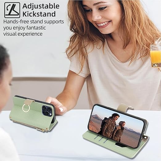 いphone15pro ケース アイフォン15 ケースプロ ショルダー ストラップ付き iphone 15 pro ケース スタンド機能 カード収納 ミラー付き 耐衝撃 肩掛け スマホケース iphone 15 pro 手帳型 おしゃれ 女性 柔らかいTPU TOO&SOO アイフォン15pro ケース 斜め掛け 適応 6.1 インチ - 緑 a