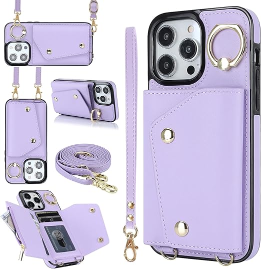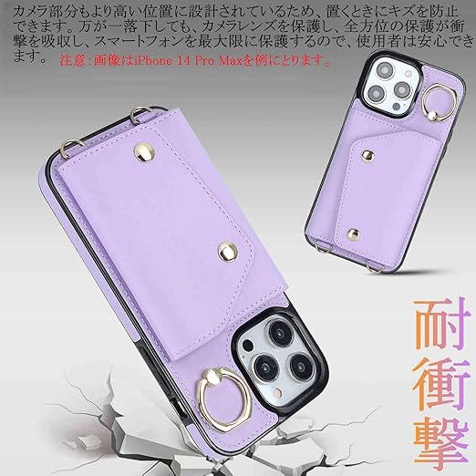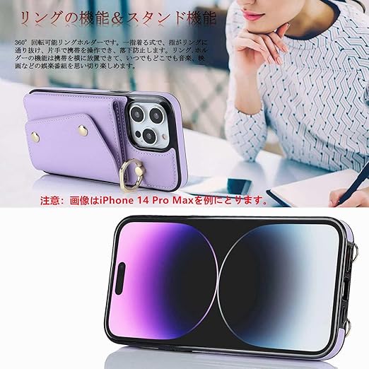 スマホカバー アイフォン15 Proケース 手帳型 PU革 カード収納 小銭入れ スマホケース iphone15 Pro 手帳型ケース 長ストラップ リング付き iphone 15 Pro 携帯カバー 肩がけ 首掛け 斜め掛け-パープル a