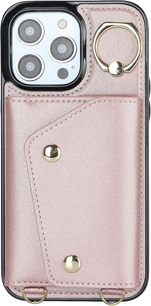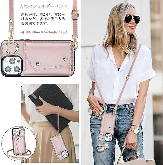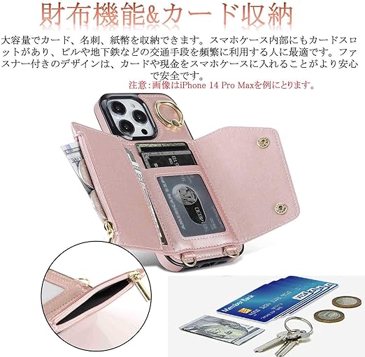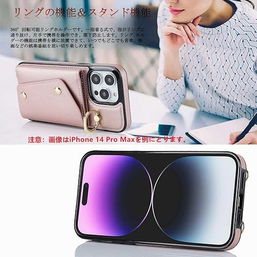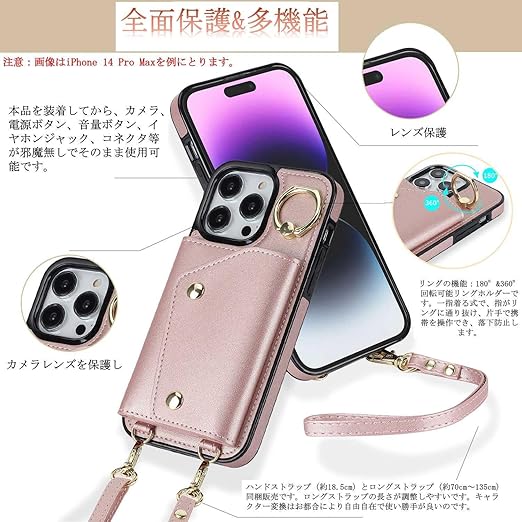 スマホカバー アイフォン15 Proケース 手帳型 PU革 カード収納 小銭入れ スマホケース iphone15 Pro 手帳型ケース 長ストラップ リング付き iphone 15 Pro 携帯カバー 肩がけ 首掛け 斜め掛け-ピンク a