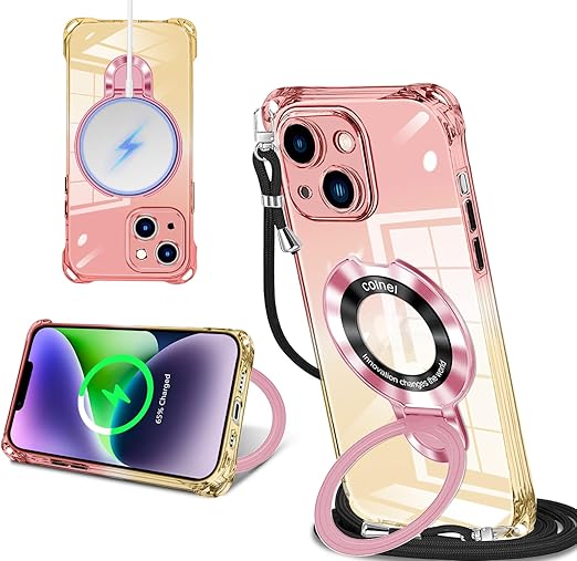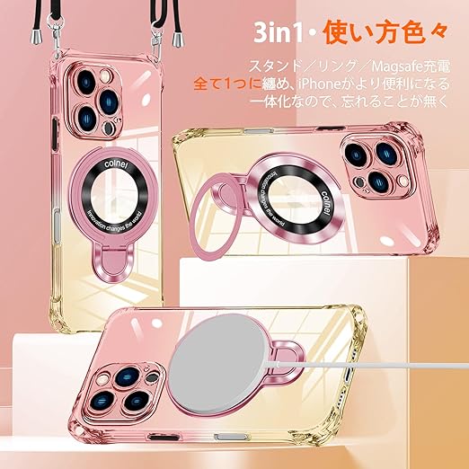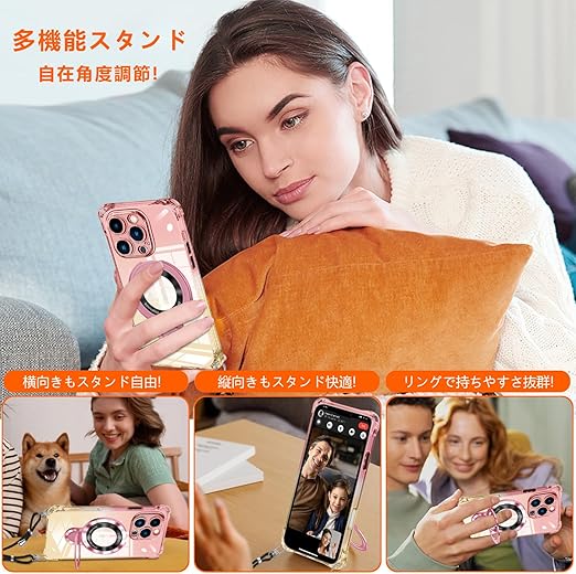 iPhone 14/ iPhone 13 用 ケース クリア MagSafe対応 リング付き ネック ショルダー アイフォン14 / 13 縄掛けケース 透明 肩掛け 斜めかけ 韓国 可愛い 縄掛け カバー 丸型スタンド付き マグネット搭載 縦横両対応 耐衝撃 ワイヤレス充電 ストラップホール付き あいほん 14 / 13 スマホケース a