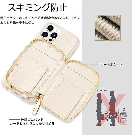 【財布付き・背面カードケース】ジッパー式+伸縮ゴムバンド。カードは伸縮ゴムでとめるため枚数にかかわらずしっかりと納まる。ファスナーポケットを加えて、お札、住宅カード鍵、お薬さえも、収納できる大容量スペースのカード入れiPhoneケース