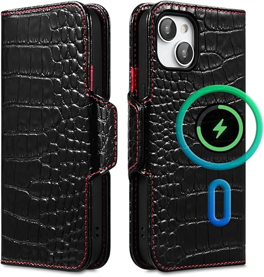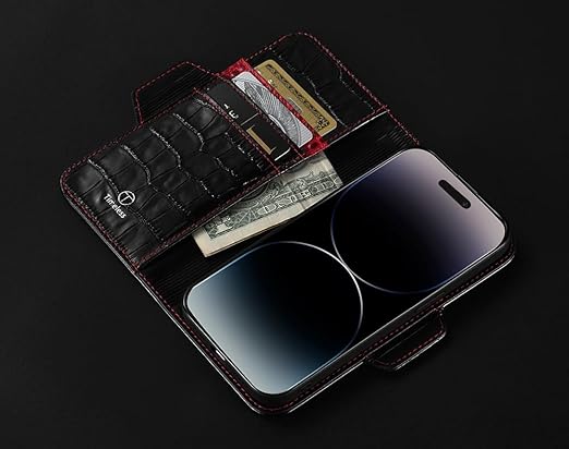 【Timeless】 iPhone 14 本革 手帳型 ケース MagSafe Qi 無線充電 対応 クロコ 型押し 牛革 高級 フルグレイン レザー 高耐久性 サイドマグネット式 黒x赤 a