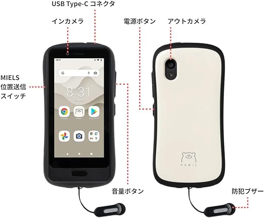 【商品仕様】名称:Hamic MIELS nico(はみっくミエルス ニコ)、OS:Android 12、カメラ…アウトカメラ:1,300万画素、インカメラ:800万画素、メモリ:3GB、ストレージ:32GB、SDカード:最大128GB、電池:3500mAh、SIM:eSIM、対応規格:Wi-Fi(b,g,n,ac) / Bluetooth(5.0) / GPS / テザリング、その他:録音機能付きGPS防犯ブザー搭載、ビーコン内蔵 【商品サイズ】本体:約縦137.3×横67.9×厚18.4mm