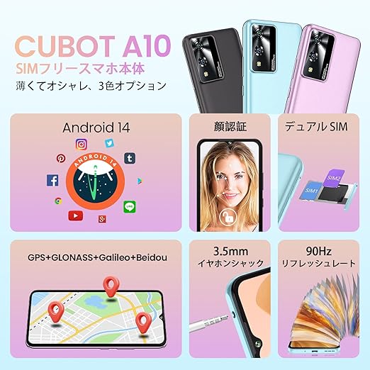 [Android 14] CUBOT A10 SIMフリースマートフォン 本体 12GB RAM+128GB 1TB拡張可能 6.56インチHD+大画面 48MP+16MPカメラ 5100mAh 大容量バッテリー 4G デュアル SIMスマホ 顔認証 GPS対応 技適認証済 グローバルバージョン a