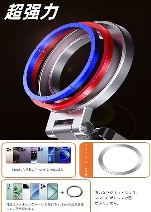 【MagSafe対応】MagSafe対応のスマホスタンドは、置くだけで瞬時にスマホをしっかり吸着します。取り付けも取り外しも簡単で、市販のグリップタイプスタンドよりも便利です。MagSafe非対応の機種にも使用できるメタルプレートも付属しています。