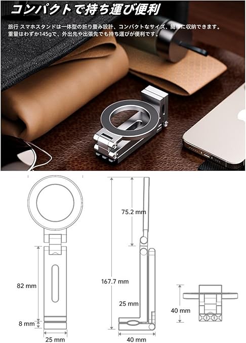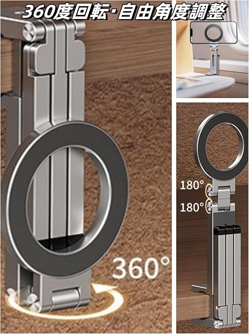 【360度回転・自由角度調整】MagSafe対応の折りたたみスタンドは、360°回転機能を搭載して、快適な角度に自在に調整できます。マグネットリングが360°回転でき、横画面と縦画面を簡単に切り替えられます。さらには折りたたみ式のため、かなりコンパク