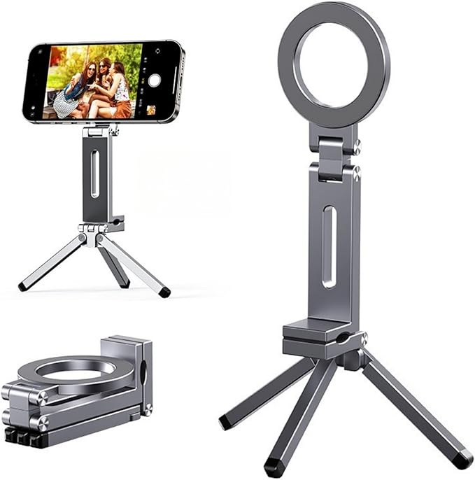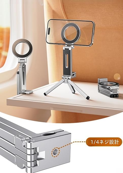 スマホスタンド MagSafe対応 折りたたみスタンド 携帯ホルダー 卓上ホルダー 自撮り棒 クリップ式 三脚付き 飛行機 旅行 デスク 超強力マグネット 360度回転 アルミ合金製 スタンド&手持ちモード 横/縦置き 小型軽量 iPhone 16 / 15 / 14 / 13 / 12対応 Android用(グレー) a