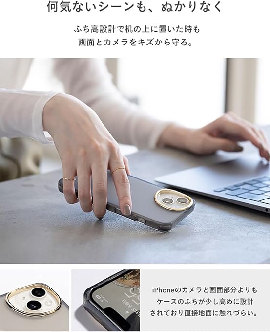 指紋が目立ちにくくキレイが続く:マットでさらさらした、気持ちの良い質感。指紋が付きにくく目立ちにくい。 / カメラや画面をキズから守るフチ高設計:フチが高く設計させており直接地面に触れにくく、キズから守る。 / ストラップホール付き:ケース側面にストラップホール付き。 / アレンジを楽しむ:お好きなカードや写真を挟んで。スモークのかかった風合いでアレンジを楽しめます。 / 落としても安心な耐衝撃設計