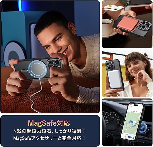 「Magsafe対応」ケースをつけたままマグセーフ機能を快適に使用できます。背面に薄くて強いマグネット内蔵しています、ワイヤレス充電や車載ホルダーやアクセサリとのあらゆる充電に安定で接着ができ、差し込みのいらないより簡単により素早く充電できます。