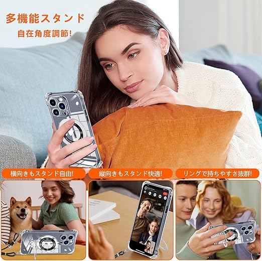 iPhone 13 Pro Max 用 ケース クリア MagSafe対応 リング付き ネック ショルダー アイフォン13プロマックス 縄掛けケース 透明 肩掛け 斜めかけ 韓国 可愛い 縄掛け カバー 丸型スタンド付き マグネット搭載 縦横両対応 耐衝撃 ワイヤレス充電 ストラップホール付き あいほん 13 Pro Max スマホケース a