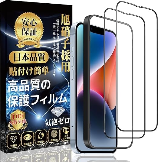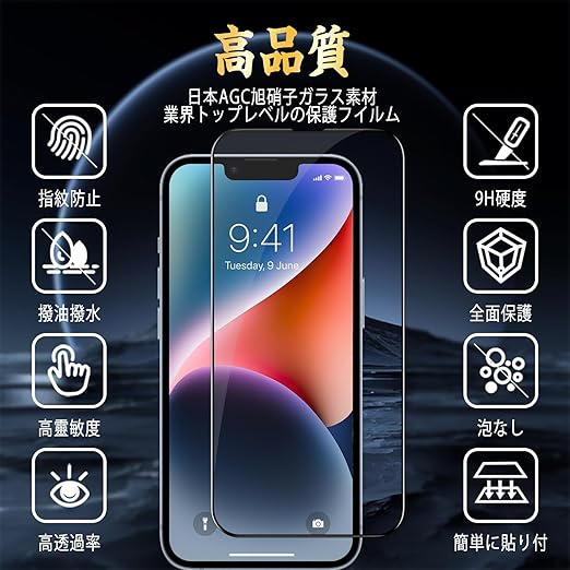 iPhone 14 / iPhone 13 ガラスフィルム 強化ガラス iPhone 13pro 保護フィルム 旭硝子素材製 耐衝撃 高透過率 高感度 撥水撥油 指紋防止 貼り付け簡単 アイフォン 14 / 13 / 13pro 強化ガラスフィルム 【2枚・全面保護 ガイド枠付き】 a