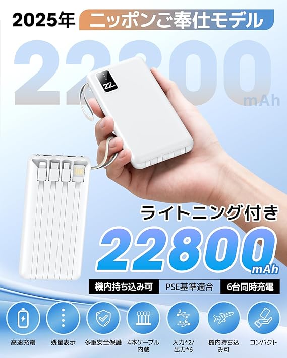 モバイルバッテリー 大容量 急速充電 【充電の達人・22800mAh・4つのケーブル内蔵】 最大2.4A出力 軽量 小型 5台同時充電可 携帯充電器 LED残量表示 スマホ充電器 コンパクト 持ち運び便利 機内持込可 旅行/出張/アウトドア/停電/防災緊急用 PSE認証済 iPhone iPad/Android全機種対応 防災グッズ LEDライト付き モバ充電 (オフホワイト) a