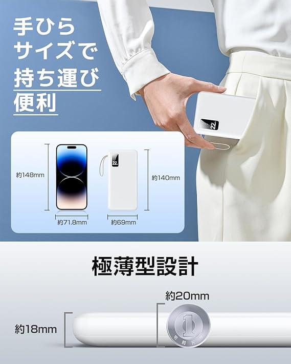 【4つ内蔵ケーブルで全機種対応・急速充電】この モバイルバッテリー ケーブル内蔵 はライトニングケーブル、Type-Cケーブル、Micro USBケーブルが内蔵されており、 モバイルバ