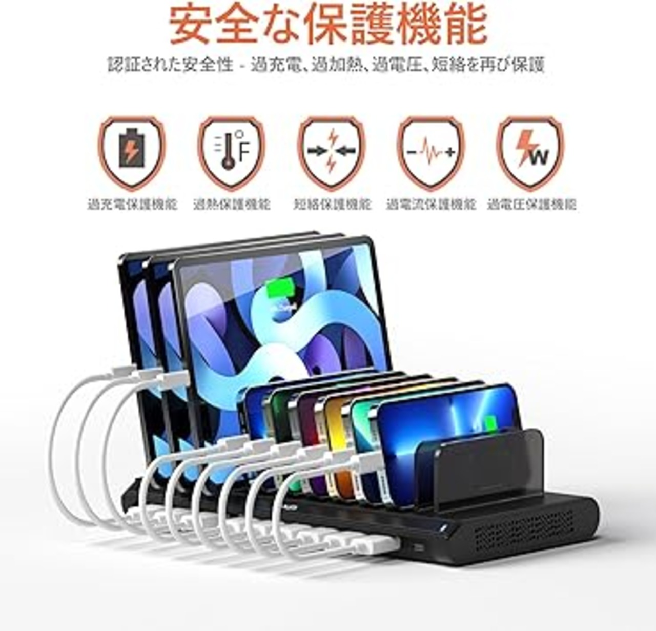 【USB 10ポート搭載】10つのUSBポートを備え( 2*QC3.0 + 1*USB-C+7*USB-A )、10台同時的に複数のデバイスを充電します。スマートIC内蔵で充電中、USBデバイス端末に適した最適な電圧を自動的に調整できます。すべてのスマホ/タブレットデバイスと完全に互換性があって、ほとんどすべてのUSBデバイスに最速の充電を提供します。 (充電ケーブルは含まれていません。)