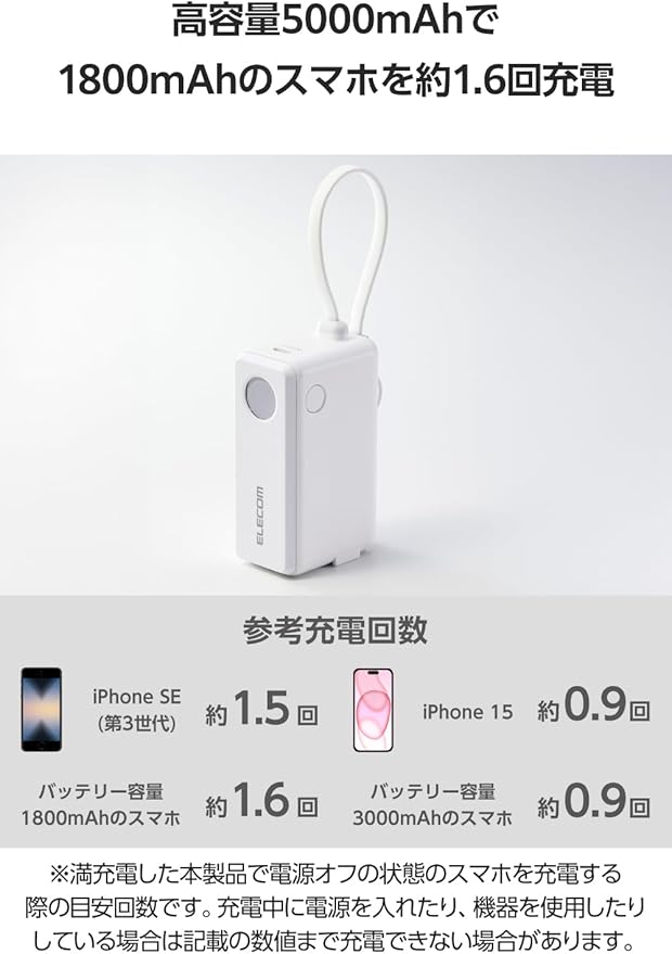 エレコム モバイルバッテリー 5000mAh 30W USB-C コンセント一体型 ケーブル一体型 Lightning変換アダプタ付き USB-C×1ポート 【PSE適合/PD対応/機内持ち込み可】 ホワイト EC-C31LWH a