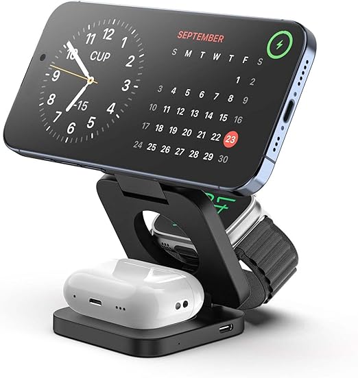 【一台三役・置くだけ充電】もうケーブルの煩わしさに悩まされる必要はありません!私たちの3in1 充電器なら、iPhone16/15/14/13/12シリーズ・マグセーフ充電ケース付きのAirPods・アップルウォッチ全シリーズに対応しておりますので、異なる充電器を使う手間を省き、これ一台で完結。磁気でカチッとくっつけるだけで、スムーズに充電がスタートします。