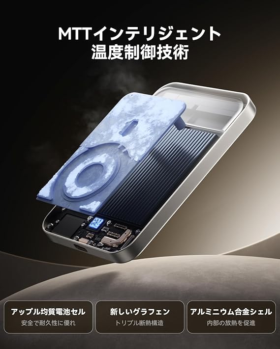 【約15mmの薄型かつ高級感ありデザイン】10000mAhの大容量ながら約15mmの薄型設計で、ポケットやポーチなどにも収納可能なコンパクトさで外出時などの持ち運びにも便利です。さらに、放熱性を向上するアルミニウム合金素材を採用すること