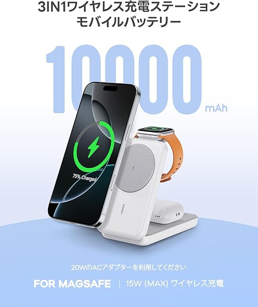 RORRY 業界初両用 ワイヤレス充電器とモバイルバッテリー 【10000mAh 大容量・ iphone apple watch airpods 同時充電・完全ワイヤレススタンド】magsafeモバイルバッテリー アップルウォッチ充 電 3台 パススルー 充電ドッグ コンパクト iPhone 16/15/14/13/12/iWatch Ultra2/S10/9/8/7/AirpodSに対応 M3 a