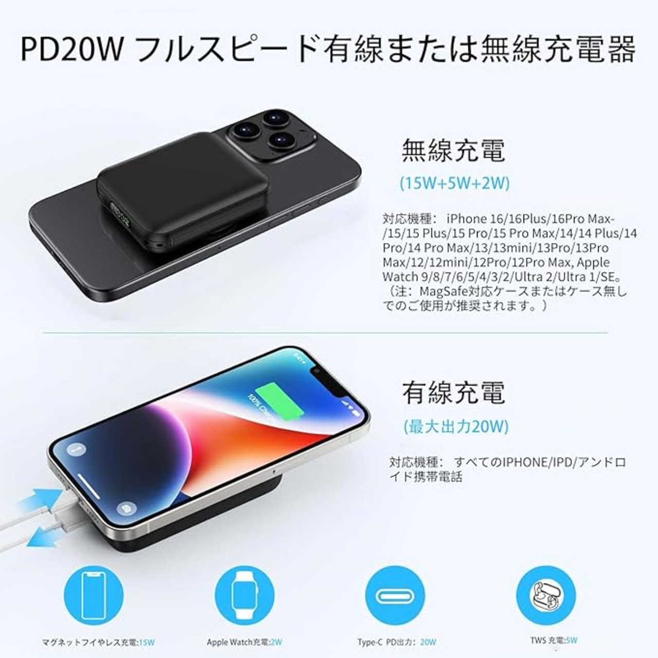 【業界最小型3in1設計&MagSafe対応強力磁吸】最大出力20Wのワイヤレス充電機能を搭載、先進技術で再び業界を席巻!強力な磁石を内蔵し、マグセーフ充電技術でiPhoneをしっかりホールドし、移動中でもズレる心配なし、革新的な技術が詰まった一品。充電中の快適さを体感し、いつでもどこでもストレスフリーな充電を楽しめます!ご注意:この磁吸式ワイヤレス充電機能はiPhone 12からiPhone 16シリーズまでのデバイスに対応しています。iPhone 12未満のモデルや他のAndroid携帯電話