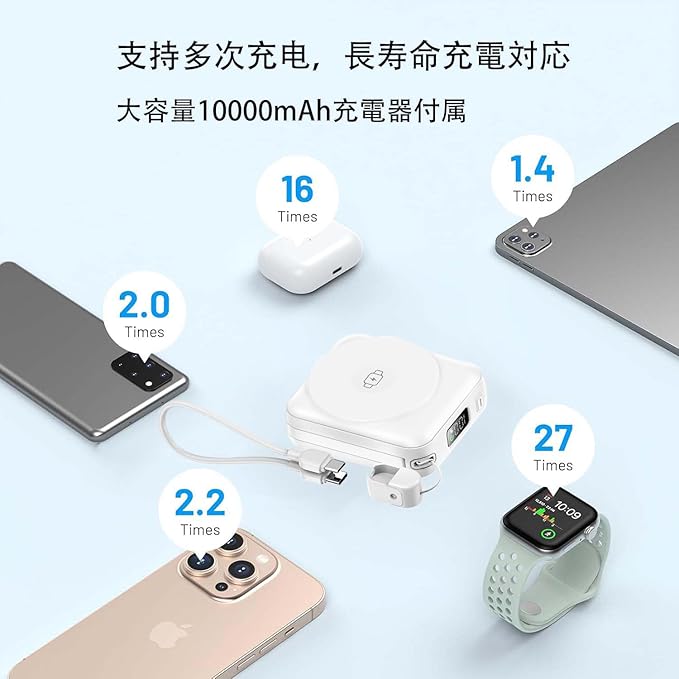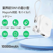 【業界初3IN1の超小型】Anwineke Magsafe対応 モバイルバッテリー 大容量 10000mAh 軽量 小型 ワイヤレス充電器 マグネット式充電器 持ち運び ケーブル内蔵 PD22.5W急速充電 3台同時充電 PSE認証済み スタンド付き LED表示 iPhone/iPad/Android/Apple Watch/Airpods多機種対応 旅行/出張/停電対策/緊急用必携(ホワイト) a
