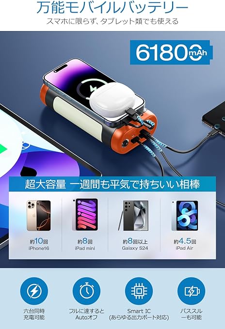 ソーラーモバイルバッテリー 【2025最新 61800mAh大容量 & 手回し発電】 22.5W/PD18W 急速充電 4本ケーブル内蔵 6台同時充電 ソーラーチャージャー 側面ライト+LEDライト付き IP67防水 防塵 耐衝撃 5way蓄電 モバイルバッテリー ソーラー充電器 コンパス搭載 フック付き 携帯便利 アウトドア/旅行/地震/災害/緊急用 防災グッズ iOS/Android各種他対応 a