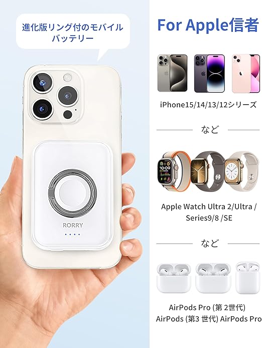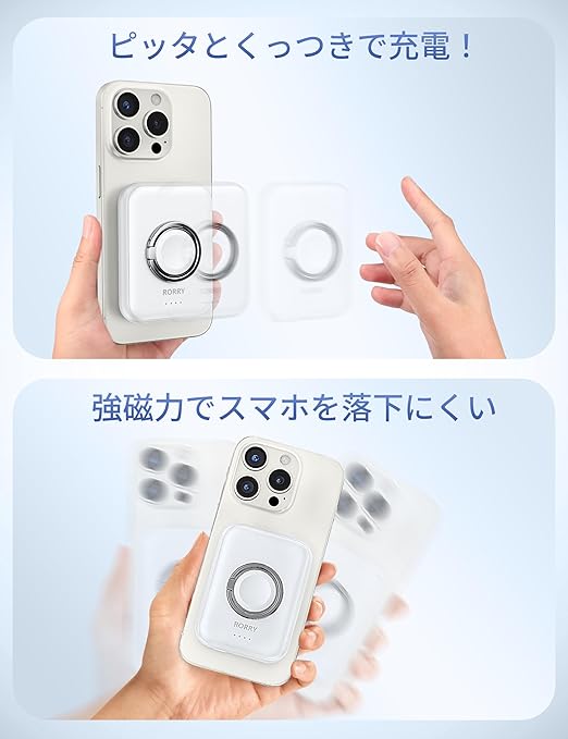 【くっつけるだけで充電できるMagSafe対応モバイルバッテリー】RORRY社はiPhone16〜12シリーズ対応のMagSafe式モバイルバッテリーがやっと新登場しました!内蔵されたマグネットでiPhone本体にくっつけるだけで充電でき、コードレスなため邪魔にならないし、持ち歩く荷物も減らせるため、バッグの中身を綺麗にまとめられます。また、磁力が強いのため、バイブレーションなどによる振動で吸着位置がズレにくく、位置ズレによって充電ができていなかったというワイヤレス充電の弱点を克服できます!さら